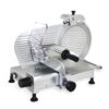 Affettatrice professionale studiata per tagliare principalmente carni. La linea curata fin nei minimi particolari con ampi raggi e priva di spigoli permette una semplice e completa pulizia garantita anche dal sistema BLC, blocco carro di scorrimento, che consente di smontare il piatto merce ed il suo supporto ed avere così un comodo accesso anche nella parte sottostante al piatto stesso. In questo caso, un apposito meccanismo di sicurezza ne permette lo smontaggio solo quando la paratia di regolazione fetta è nella posizione “0” in modo tale che la lama sia completamente protetta.