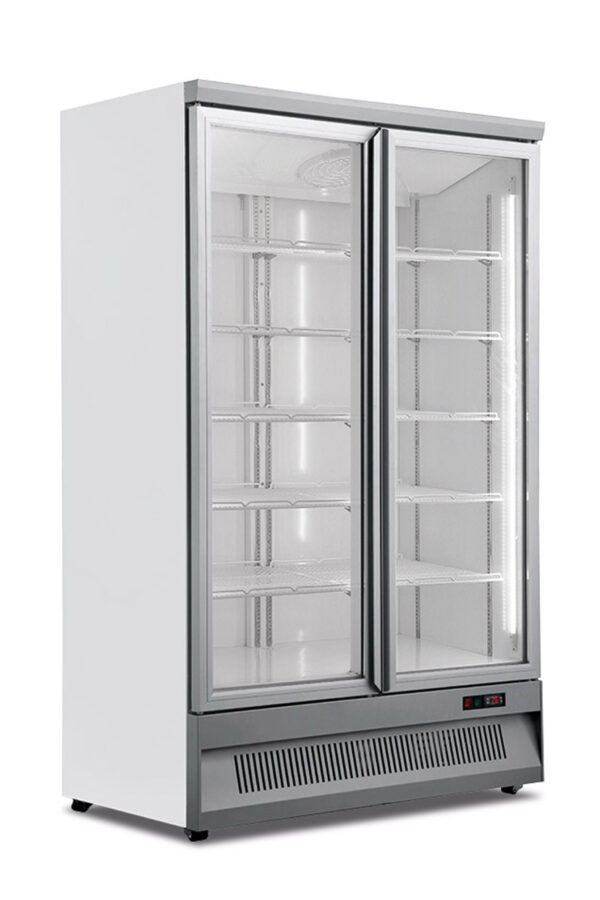 La vetrina congelatore murale ventilata 2 porte MR 126 BT2 WHT ha una capacità di 930 litri e una temperatura regolabile tra -18°C e -22°C, ideale per mantenere intatte le proprietà e il sapore dei prodotti. Questa vetrina congelatore è dotata di una struttura esterna in acciaio inox e una struttura interna in alluminio martellato, che garantiscono resistenza e durata nel tempo. All’interno è dotato di illuminazione a led, che consente di esporre i tuoi alimenti in modo accattivante e di risparmiare energia. Il termometro digitale e il regolatore temperatura elettronico ti permettono di monitorare e impostare facilmente la temperatura desiderata. La vetrina murale è composta da tre porte battenti con chiusura automatica, che assicurano una buona tenuta termica e una comoda apertura. Le 4 ruote alla base ti consentono di spostare la vetrina congelatore con facilità, in base alle tue esigenze. Questo congelatore armadio è inoltre dotato di un sistema di sbrinamento automatico e di una refrigerazione ventilata, che garantiscono una distribuzione uniforme del freddo e una riduzione della formazione di brina. Il gas refrigerante R290 è ecologico e ha un basso impatto ambientale. Lo spessore del materiale isolante è di ben 60 mm, che contribuisce a mantenere una bassa dispersione di calore e a ridurre i consumi. All’interno del congelatore sono presenti 10 mensole da 551 x 473 mm che offrono la possibilità di organizzare i tuoi alimenti in modo ordinato e funzionale.