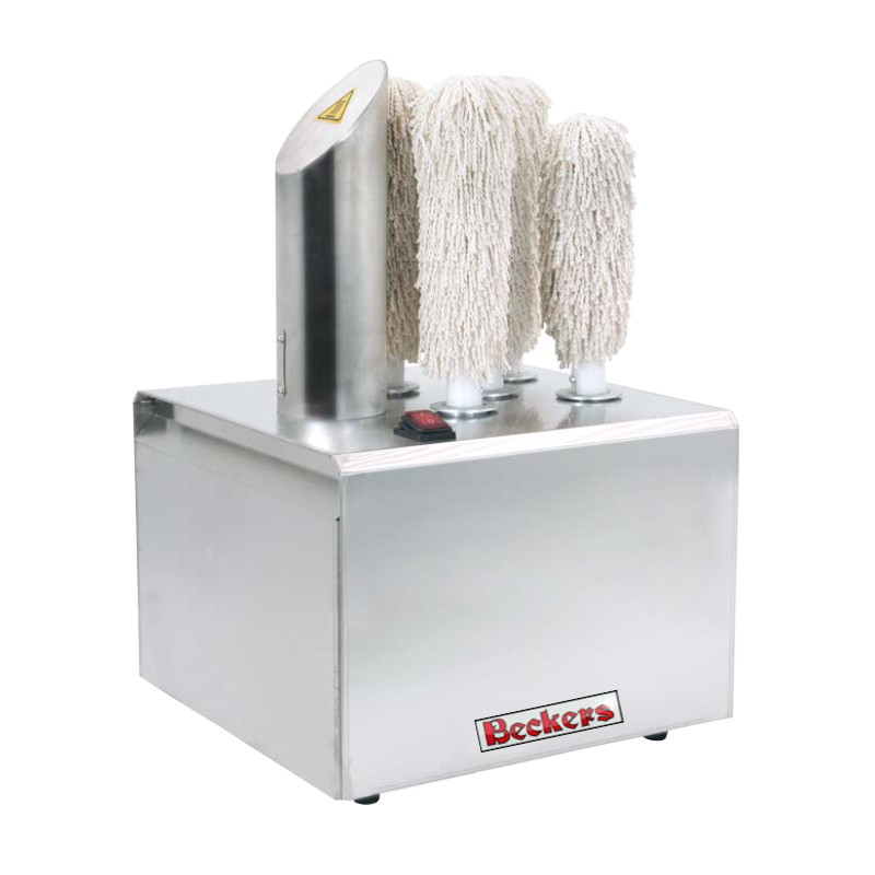 Telaio in Acciaio Inox AISI 304, con N° 5 Spazzole Rotanti in Fibra facilmente rimovibili – Ventilatore ad Aria Calda (temperatura di lavoro 60°C), Tubo di Uscita Aria Calda in Acciaio Inox AISI 304, Ventola di protezione surriscaldamento. Piedini antiscivolo e Interruttore ON/OFF