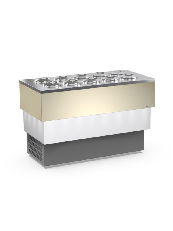 BANCO A POZZETTO – ESPOSITORE GELATO Mod. CARRARA CREAM 10 + 10 CARAPINE DA 7,5 L – Temp. -5°C/-20°C Dim. 151×72,4×97,6h