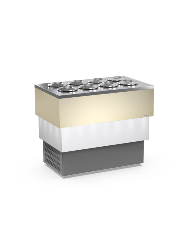 BANCO A POZZETTO – ESPOSITORE GELATO Mod. CARRARA CREAM 8 + 8 CARAPINE DA 7,5 L – Temp. -5°C/-20°C Dim. 118×72,4×97,6h