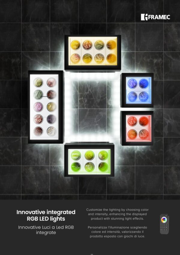 - Luci a led RGB incluse all’interno del vano espositivo con gestione colore e intensità della luce