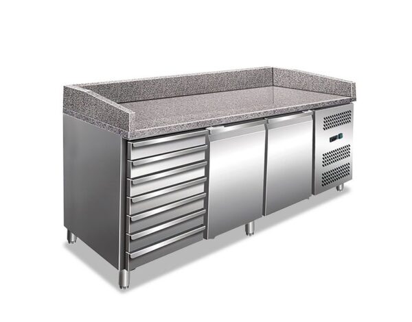 BANCO PIZZA REFRIGERATO POSITIVO VENTILATO 2 PORTE CON CASSETTIERA – MOD. PZ 2610 TN – Temp. +2°C/+8°C – Piano in granito – Dim. cm. L202,5xP80xh100