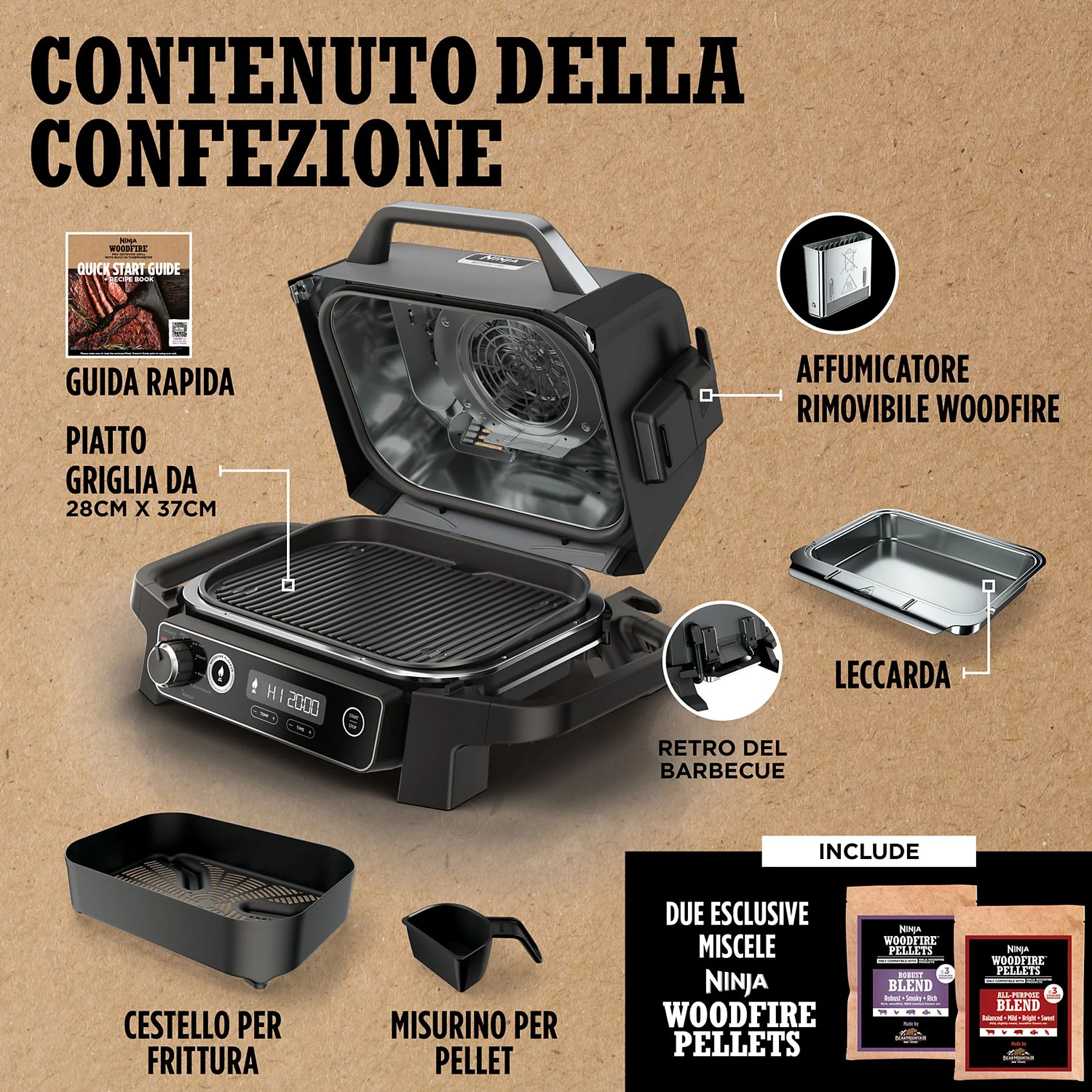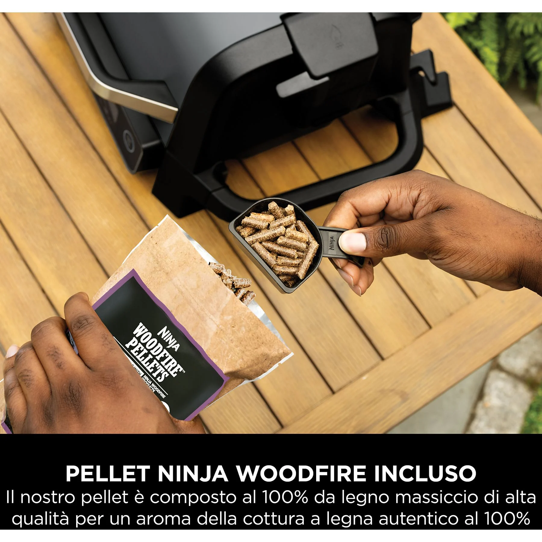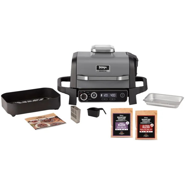 La griglia include 2 confezioni di pellet Woodfire dei diversi aromi e l’apposito misurino per un dosaggio perfetto. È possibile acquistare pellet Ninja Woodfire aggiuntivi direttamente da Ninja..
