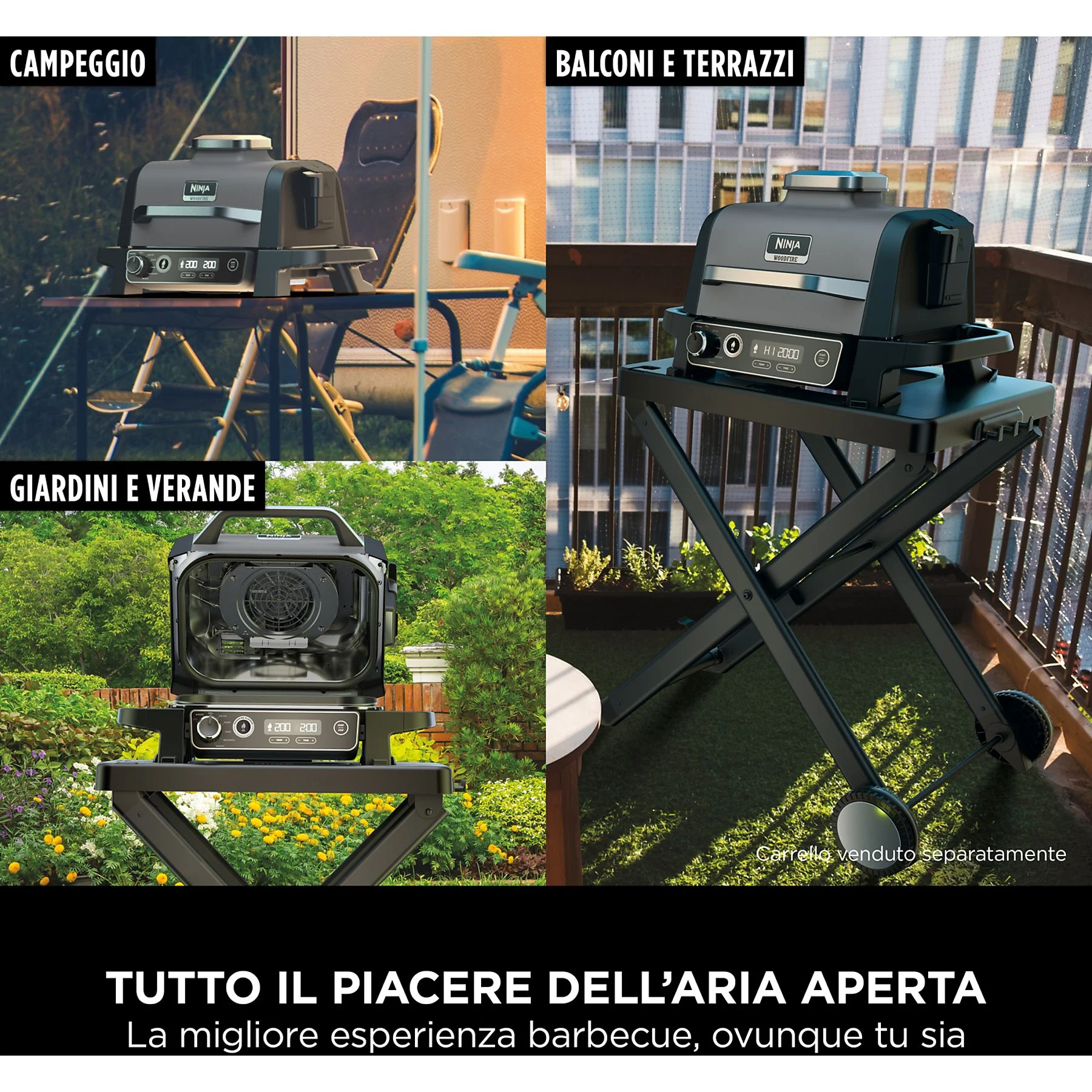 Alimentazione elettrica vuol dire niente carbonella, gas o fiamme, per un uso sicuro in giardini, balconi, porticati, campeggi e altri piccoli spazi esterni.