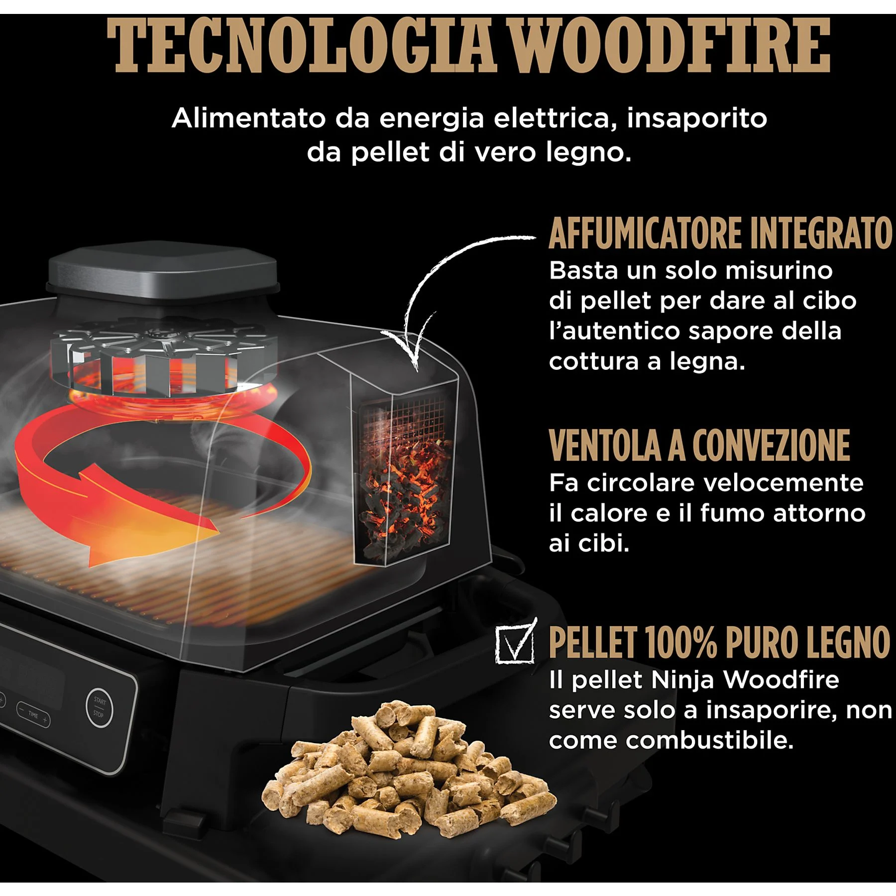 Tecnologia Woodfire: Alimentato da energia elettrica, insaporito da pellet di vero legno.