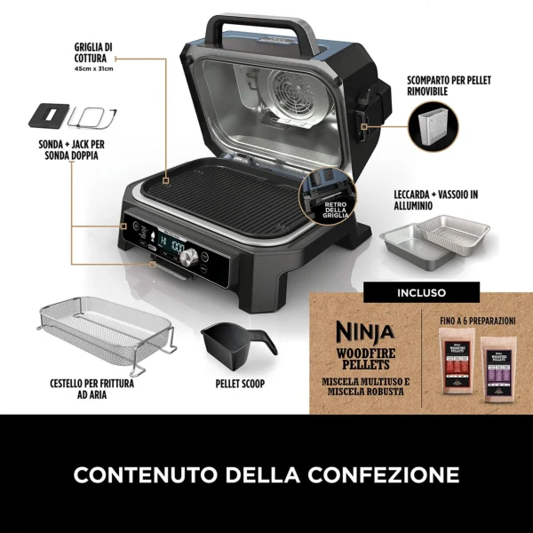 Il barbecue elettrico include una confezione di pellet Ninja Woodfire di ogni aroma e l’apposito misurino per un dosaggio perfetto. È possibile acquistare altre confezioni di pellet direttamente sul sito web di Ninja.