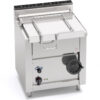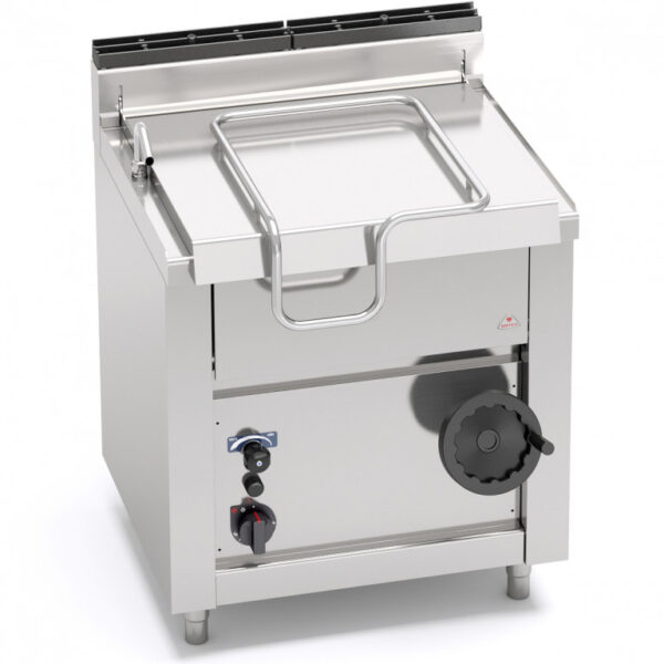 Coperchio fissato su cerniera autobilanciata. Vasca di cottura con fondo e pareti in acciaio inox AISI 304, ribaltabile manualmente fino a 80°, con finitura antiaderente a microsfere in ceramica ed angoli arrotondati. Fondo vasca in acciaio spessore 10 mm, saldato esternamente, per una migliore conducibilità termica. Riscaldamento uniforme tramite bruciatori a diretto contatto con il fondo. Accensione piezoelettrica con protezione in silicone e bruciatore pilota. Ideale per cotture umide. Valvola termostatica per la regolazione lineare della temperatura da 100 a 300°C circa tramite manopola a 7 posizioni. Sicurezza termoelettrica. Piedini regolabili.