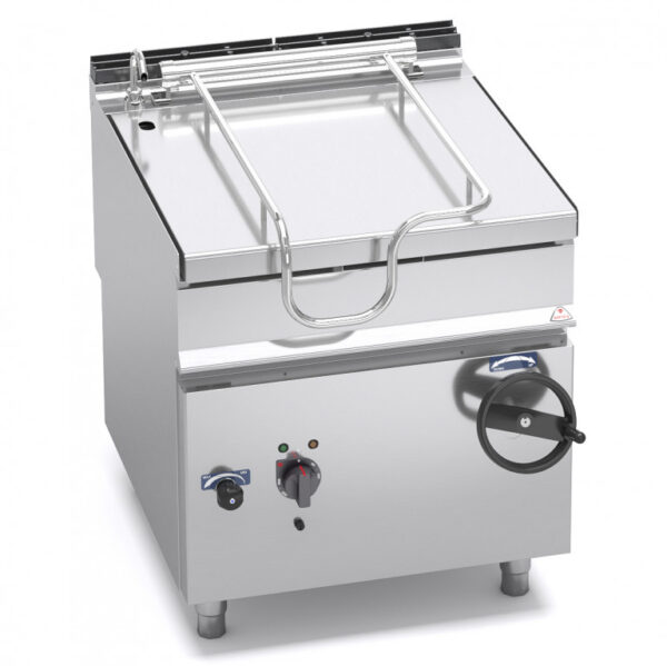 Costruzione interna ed esterna completamente in acciaio inox, parti esterne con finitura Scotch Brite. Coperchio fissato su cerniera auto-bilanciata in acciaio inox AISI 304, con maniglia di grande spessore in acciaio inox AISI 304.Vasca di cottura con pareti in acciaio inox AISI 304 spessore 20/10, con finitura antiaderente a microsfere in ceramica ed angoli completamente arrotondati. Fondo vasca radiante in acciaio spessore 10 mm, saldato esternamente. Rubinetto erogatore con collo di grande portata posto sul piano. Volantino per il sollevamento vasca con maniglia rientrante. Microinterruttore di sicurezza per l’arresto del funzionamento a vasca alzata. Termostato di sicurezza a riarmo manuale.Riscaldamento uniforme del fondo tramite resistenze elettriche corazzate in acciaio inox AISI 304 fissate sulla parte inferiore del fondo vasca e rivestite con materiale isolante. Erogazione della potenza controllata da interruttore e termostato (100°C – 300°C).