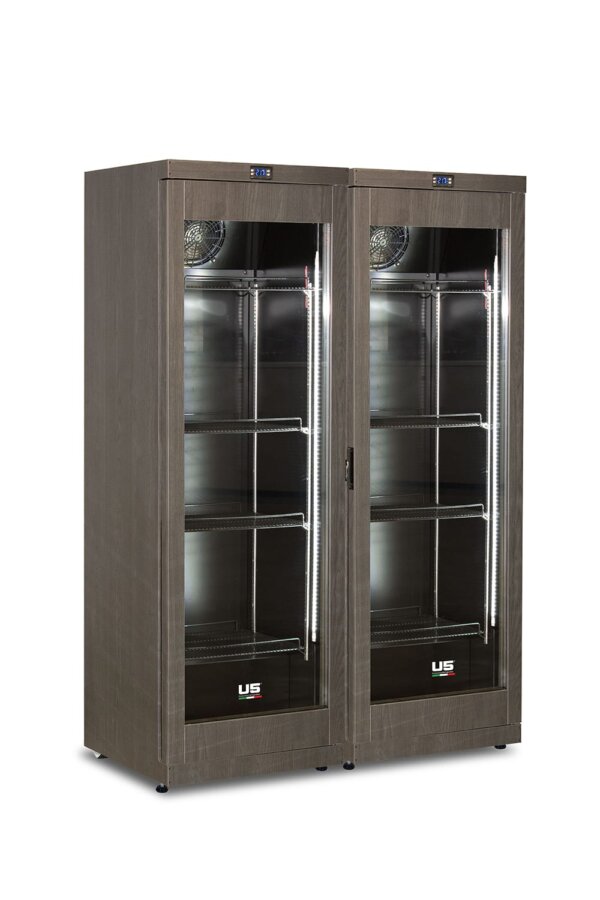 Vetrina da vino doppia ottenuta per accoppiamento di due CW 400 L di cui una con porta invertita. CW 800 L utilizza gas ritenuti non dannosi per l’ambiente. Made in ITALY