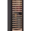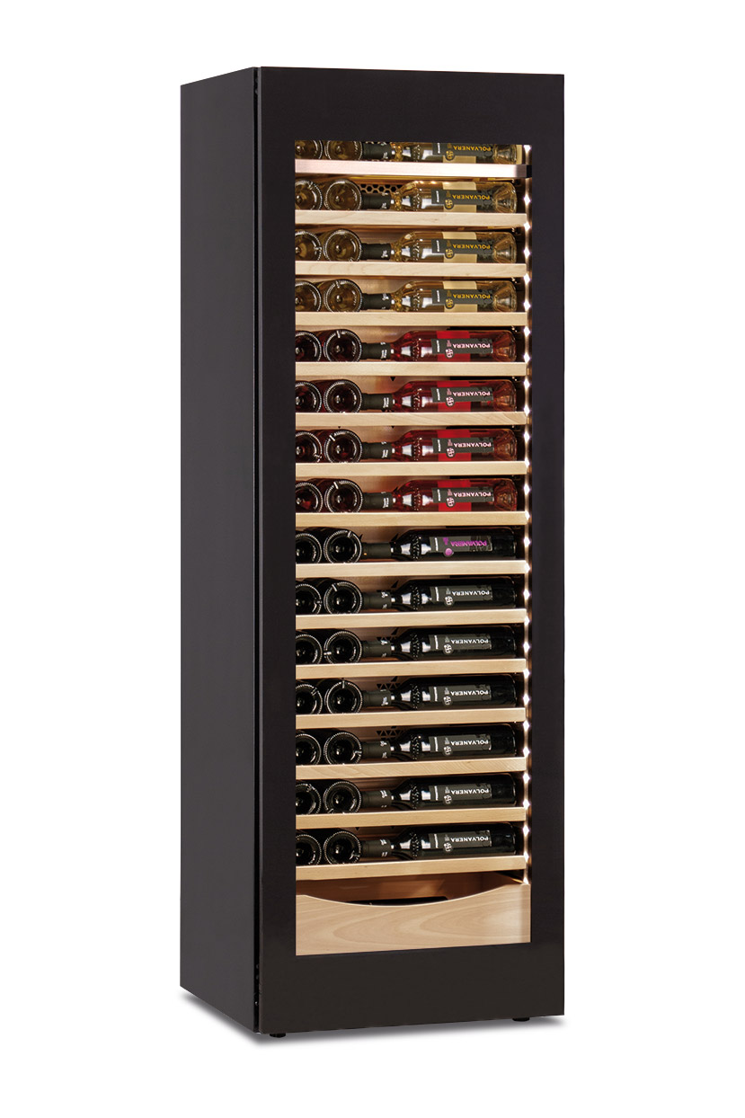 Frigo cantinetta viniventilato, che permette di regolare la temperatura tra +2 °C / +20 °C in base al tipo di vino che si vuole conservare. Questo frigo per vino ha una struttura esterna in lamiera preverniciata nera con trattamento anticorrosione mentre all’interno è in ABS nero. La porta è in vetro con serigrafia nera e doppio vetro temperato, per garantire un’ottima isolazione termica e una protezione dai raggi UV. È dotato di un termostato elettronico con touch screen, che consente di impostare facilmente la temperatura desiderata. Questo modello di cantinetta frigo per vini ha una capacità di 315 litri e può contenere fino a 112 bottiglie da 75 cl. Le bottiglie sono disposte su 15 mensole in legno ad estrazione a cassetto, che facilitano l’accesso e la visibilità dei vini. Il frigo è dotato di una luce interna a Led, che crea un’atmosfera elegante e valorizza i vini. È di classe climatica 4 con dimensioni di 59.5x55x179 (h) cm e un peso netto di 88 kg. Facile da installare e da usare, grazie ai 4 piedi regolabili e alla porta reversibile.