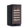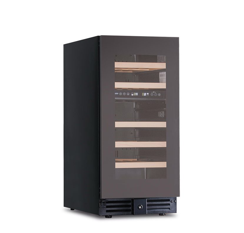 Frigo per vini ventilato con due zone di temperatura, che permette di regolare la temperatura interna da +2°C a +20°C, a seconda delle esigenze. In particolare la zona più alta della cantinetta ha un range di temperatura +2/+12°C, mentre la zona più bassa tra +12/+20°C. Il frigo ha una struttura esterna in lamiera preverniciata nera, resistente alla corrosione, e un interno in ABS nero, facile da pulire. La porta è in vetro con serigrafia nera, senza cornice, ed ha una chiusura con chiave per garantire la sicurezza delle tue bottiglie. Questa cantinetta è dotato di un termometro digitale e di un regolatore temperatura elettronico con touch screen, che ti consente di monitorare ed impostare facilmente la temperatura desiderata. Inoltre, ha un sistema di sbrinamento automatico a fermo compressore e di evaporazione automatica dell’acqua di condensa, che ne assicurano il corretto funzionamento e la bassa manutenzione. Ha una capacità di 86 litri e grazie alle 6 mensole in legno ad estrazione a cassetto può ospitare fino a 28 bottiglie da 75 cl. Le mensole sono regolabili in altezza e permettono di organizzare lo spazio interno come preferisci ed è presente una luce interna a Led, che illumina le tue bottiglie con eleganza. Il frigo vini ha un peso netto di 45 kg e delle dimensioni esterne di 38 x 57,3 x (h)82 cm. Il frigo vini ha una temperatura di esercizio tra +2° a +20°C ed è di classe climatica 4. Prodotto perfetto per chi ha la necessità di conservare il vino in modo professionale ed elegante.