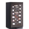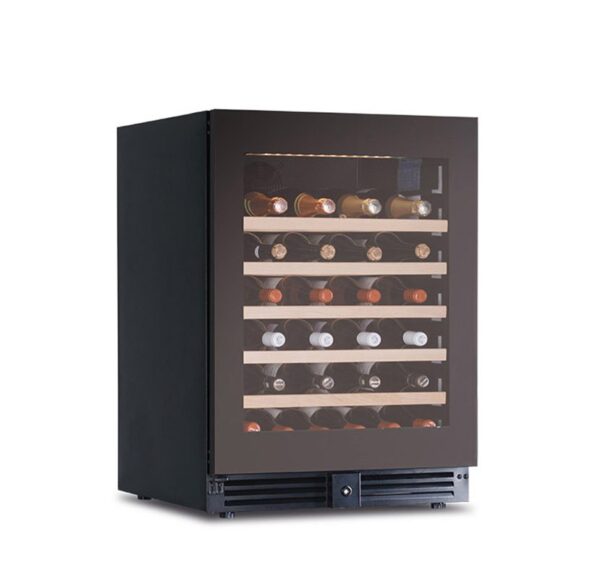 Frigo per vini ventilato che permette di regolare la temperatura interna tra +2°C a +20°C, a seconda delle tue esigenze. Il frigo ha una struttura esterna in lamiera preverniciata nera, resistente alla corrosione, e un interno in ABS nero, facile da pulire. La porta è in vetro con serigrafia nera, senza cornice, ed ha una chiusura con chiave per garantire la sicurezza delle tue bottiglie. Questa cantinetta è dotato di un termometro digitale e di un regolatore temperatura elettronico con touch screen, che consente di monitorare ed impostare facilmente la temperatura desiderata. Inoltre, ha un sistema di sbrinamento automatico a fermo compressore e di evaporazione automatica dell’acqua di condensa, che ne assicurano il corretto funzionamento e la bassa manutenzione. Ha una capacità di 150 litri e grazie alle 6 mensole in legno ad estrazione a cassetto, può ospitare fino a 52 bottiglie da 75 cl. Le mensole sono regolabili in altezza e ti permettono di organizzare lo spazio interno come preferisci ed è presente una luce interna a Led, che illumina le tue bottiglie con eleganza. Il frigo vini ha un peso netto di 87 kg e delle dimensioni esterne di 59,5 x 57,3 x (h)82 cm. Il frigo vini ha una temperatura di esercizio tra +2° a +20°C ed è di classe climatica 4.