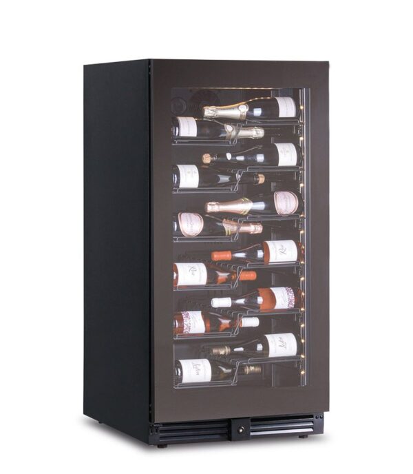 Frigo per vini ventilato che ti permette di regolare la temperatura interna tra +2°C a +20°C, a seconda delle tue esigenze. Il frigo ha una struttura esterna in lamiera preverniciata nera, resistente alla corrosione, e un interno in ABS nero, facile da pulire. La porta è in vetro con serigrafia nera, senza cornice, ed ha una chiusura con chiave per garantire la sicurezza delle tue bottiglie. Questa cantinetta è dotato di un termometro digitale e di un regolatore temperatura elettronico con touch screen, che ti consente di monitorare ed impostare facilmente la temperatura desiderata. Inoltre, ha un sistema di sbrinamento automatico a fermo compressore e di evaporazione automatica dell’acqua di condensa, che ne assicurano il corretto funzionamento e la bassa manutenzione. Ha una capacità di 273 litri e grazie alle 6 mensole in metallo con design a “Z” ad estrazione a cassetto può ospitare fino a 68 bottiglie da 75 cl. Le mensole sono regolabili in altezza e ti permettono di organizzare lo spazio interno come preferisci ed è presente una luce interna a Led, che illumina le tue bottiglie con eleganza. Il frigo vini ha un peso netto di 87 kg e delle dimensioni esterne di 59,5 x 69 x (h)120 cm. Il frigo vini ha una temperatura di esercizio tra +2° a +20°C ed è di classe climatica 4. Prodotto perfetto per chi ha la necessità di conservare il vino in modo professionale ed elegante.