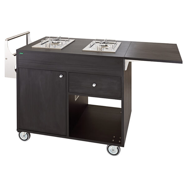 Carrello Flambè – 2 piastre – 2 fuochi – 1 sportello vano porta bombola da 3 Kg – 4 ruote con freno ø 100 mm