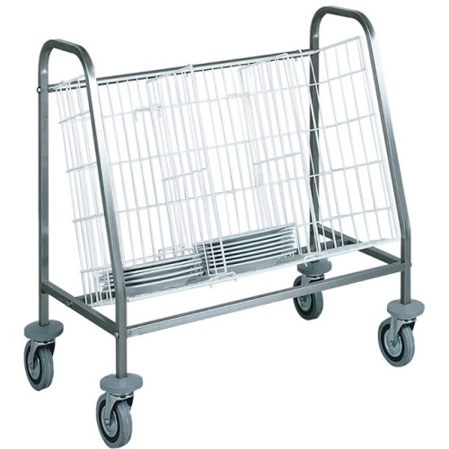 | Descrizione | Carrelli per ritiro, distribuzione e stoccaggio vassoi, piatti, tazze, ecc. Telaio in acciaio inox – cesti asportabili in filo di acciaio plastificato – paracolpi – ruote multidirezionali ø 125 mm. 1 cesto. |