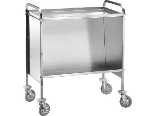 | Descrizione | Carrelli per il trasporto piatti. Struttura in tubo di acciaio inox – ripiano portapiatti e pannellatura in lamiera di acciaio inox – ruote multidirezionali ø 125 mm. |