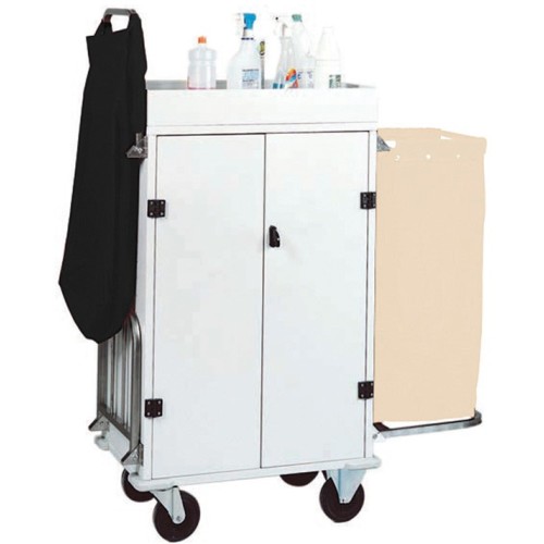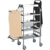 Carrello portabiancheria, pulizia e multiuso. Struttura in lamiera verniciata a polveri epossidiche – 2 portasacchi, in dotazione un sacco in tessuto ignifugo – vaschetta porta detersivi superiore – ruote ø 140 mm, di cui 2 fisse e 2 girevoli.