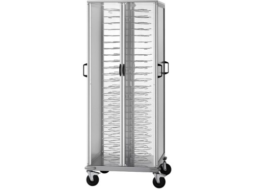 Carrelli portapiatti armadiati. Struttura portante in acciaio plastificato – telaio in alluminio anodizzato – pannellatura in perfex con 4 sportelli apribili in plexiglass – griglie verniciate o cromate – maniglie laterali per conduzione carrello – ruote multidirezionali ø 125 mm di cui due con freno.