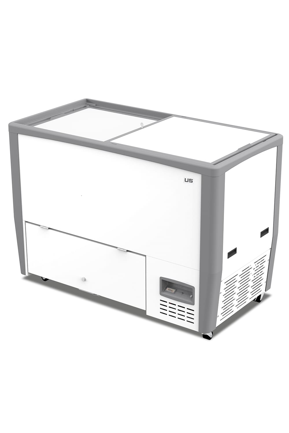 Frigo a pozzetto di grandi dimensioni per gelato impulso con coperchi scorrevoli coibentati. Angolari in plastica a protezione dai piccoli urti e vano scorta con cestello. BMAX 680 CC utilizza gas ritenuti non dannosi per l’ambiente.