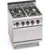 Piano di lavoro e pannelli frontali in acciaio inox AISI 304. Bruciatori garantiti a vita interamente in ghisa nichelata a singola e doppia corona ad alta potenza azionati da rubinetto valvolato con termocoppia di sicurezza e spia pilota. Griglie in ghisa. Bacinelle asportabili per la massima igiene e per una facile manutenzione. Forno elettrico statico interamente costruito in acciaio INOX, con supporti a 4 livelli per griglie/teglie 2/1GN. Grill con funzione salamandra nella parte superiore e termostato che permette un’accurata regolazione della temperatura da 50° a 270° C. Spia di linea e spia di raggiungimento temperatura. Porta e controporta stampate in acciaio INOX AISI 304. Maniglia porta ad alta resistenza in acciaio AISI 304 in spessore 20/10. Piedini regolabili. Standard: no. 1 griglia forno antiribaltamento.