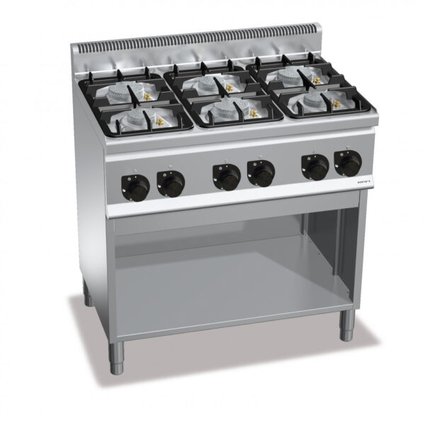 La cucina a gas 6 fuochi su vano Berto’s G6F6MPW Serie 60 è ideale per cucine professionali modulari. Realizzata in acciaio inox, garantisce resistenza e facilità di pulizia. Piano di lavoro e pannelli frontali in acciaio inox AISI 304. Bruciatori interamente in ghisa, garantiti a vita, azionati da rubinetto valvolato e fissati a tenuta di liquidi al piano in acciaio AISI 304 a profondo stampaggio. Modelli dotati di termocoppia di sicurezza e fiamma pilota fuochi protetta da copertura in ottone per una facile pulizia e manutenzione. Piedini regolabili (versioni con mobile).