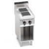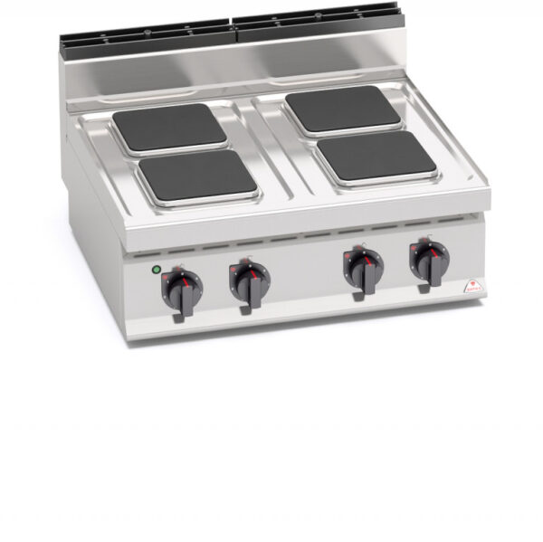 Piano di lavoro e pannelli frontali in acciaio inox AISI 304. Piano stampato in un pezzo unico a tenuta stagna. Piastre in ghisa con termostato di sicurezza e selettore a 6 posizioni che attiva 6 diverse zone concentriche di potenza. Spie di controllo tensione e lavoro.