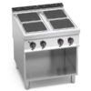 Piano di lavoro in acciaio inox AISI 304 , pannelli frontali e laterali in acciaio inox AISI 304, finitura Scotch Brite. Piano stampato in un pezzo unico a tenuta stagna. Piastre in ghisa con termostato di sicurezzae selettore a 6 posizioni che attiva 6 diverse zone concentriche di potenza. Forno elettrico con resistenze in acciaio inox incoloy dal diametro maggiorato. Grill con funzione salamandra nella parte superiore e termostato che permette un’accurata regolazione della temperatura da 50° a 270°C. Camera forno in AISI 430, con supporti a 4 livelli e controporta stampata e nervata in acciaio inox. Spia di linea e spia di raggiungimento temperatura.Maniglie con doppio stampo ad alta resistenza in acciaio inox AISI 304, spessore 20/10.