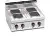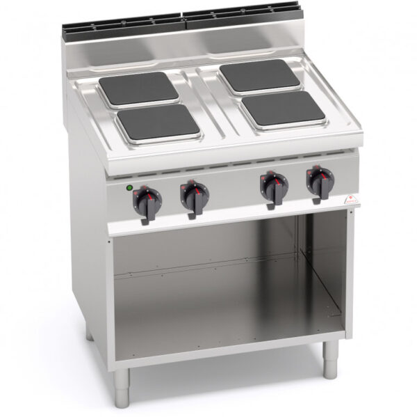 Piano di lavoro e pannelli frontali in acciaio inox AISI 304. Piano stampato in un pezzo unico a tenuta stagna. Piastre in ghisa con termostato di sicurezza e selettore a 6 posizioni che attiva 6 diverse zone concentriche di potenza. Spie di controllo tensione e lavoro. Piedini regolabili.