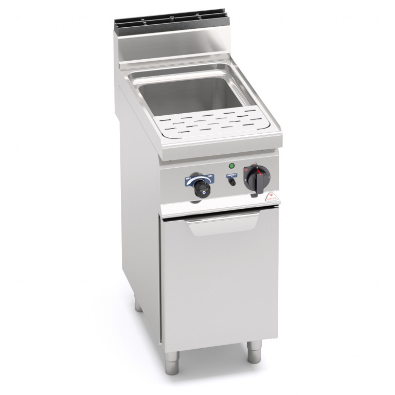 Piano di lavoro e pannelli frontali in acciaio inox AISI 304. Vasca stampata con ampi bordi arrotondati realizzata completamente in acciaio INOX AISI 316. Capacità utile della vasca 30 Lt. Circolazione dell’acqua garantita da un fondo forato che distanzia i cesti dal fondo della vasca e protegge le resistenze situate direttamente all’interno della vasca. Troppopieno di grande diametro per l’eliminazione degli amidi in eccesso durante la cottura. Rubinetto di scarico a sfera, situato all’interno della vano, comandato da maniglia con impugnatura atermica. Piedini regolabili. Standard: 1P sportello con maniglia stampata spessore 20/10