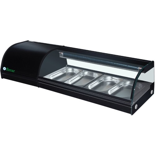 Vetrine refrigerate per sushi e tapas con refrigerazione statica. Le vetrine sushi e le vetrine per tapas sono disponibili nel colore nero, la linea Tapas (TS) è a due ripiani – struttura in plastica e vetro – porte scorrevoli in vetro – vetro frontale curvo – illuminazione LED – termostato manuale – bacinelle GN1/3 400(h) mm incluse.