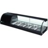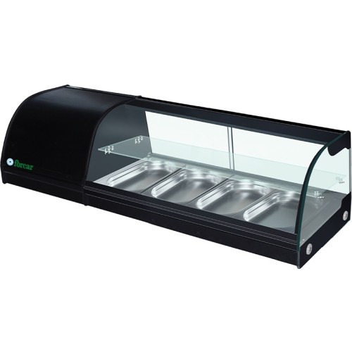 Vetrine refrigerate per sushi e tapas con refrigerazione statica. Le vetrine sushi e le vetrine per tapas sono disponibili nel colore nero, la linea Tapas (TS) è a due ripiani – struttura in plastica e vetro – porte scorrevoli in vetro – vetro frontale curvo – illuminazione LED – termostato manuale – bacinelle GN1/3 400(h) mm incluse.
