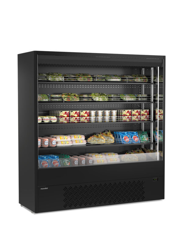 Il Murales 19 B Mondial è un espositore murale refrigerato ventilato ad alta capacità, progettato per supermercati, negozi alimentari e attività horeca con grande afflusso di clienti. La refrigerazione ventilata garantisce una temperatura stabile tra +0°C e +4°C, ideale per bevande, latticini e prodotti freschi confezionati.