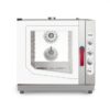 Struttura e camera di cottura in acciaio inox, luce interna con lampade alogene, guarnizione professionale a pressione nella porta, camera di cottura con bordi arrotondati per una facile pulizia, porta vetrata a bassa emissione di calore, motori con ventola inverter automatica, regolazione elettronica diretta della percentuale di vapore, porta ad apertura laterale, comandi meccanici e digitali.