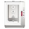 Struttura e camera di cottura in acciaio inox, luce interna con lampade alogene, guarnizione professionale a pressione nella porta, camera di cottura con bordi arrotondati per una facile pulizia, porta vetrata a bassa emissione di calore, motori con ventola inverter automatica, regolazione elettronica diretta della percentuale di vapore, porta ad apertura laterale, comandi meccanici e digitali.