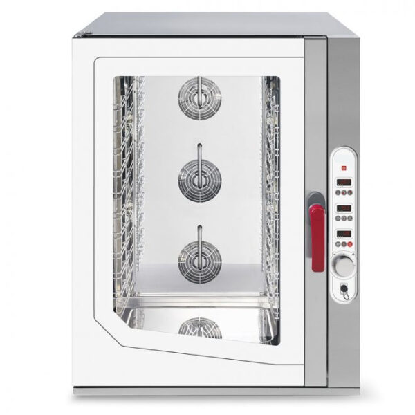 Il controllo touch screen con display da 7 ” con una risoluzione di 800×480, connessione WI-FI con Android per il monitoraggio remoto (da PC, Tablet o Smartphone) USB, diagnostica, motore trifase ad alto rendimento, sistema di ventilazione reversibile bidirezionale (ogni 80 secondi), impostazione automatica di preriscaldamento (1 teglia – mezzo carico – teglie pieno carico), Funzione di mantenimento (mantenere la temperatura dopo la cottura di 70 °). Perfetto controllo della temperatura, distribuzione dinamica del sistema di circolazione dell’aria con inverter. Sistema autopulente integrato.
