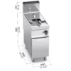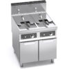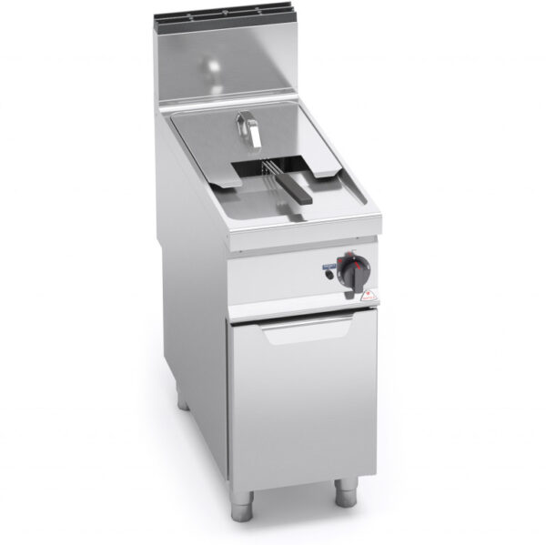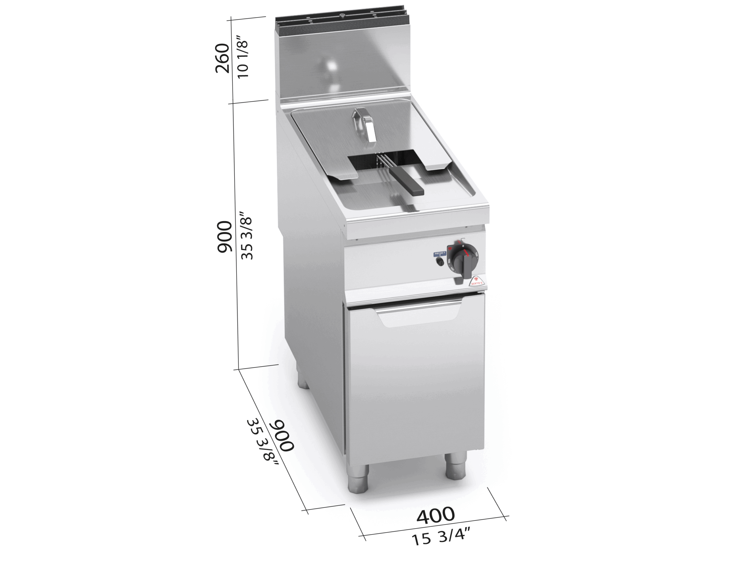 Piano di lavoro e pannelli frontali in acciaio inox AISI 304. Vasca stampata con profilo ad ampia zona fredda per raccolta residui cibo e grande facilità di pulizia grazie all’assenza di tubi ed alla grande sezione dello scarico da 1”. Il piano, dai bordi arrotondati, incorpora una superficie per l’appoggio dei cesti leggermente inclinata, favorendo lo scarico dell’olio. Due bruciatori in acciaio inox, posti esternamente alla vasca, comandati da elettrovalvola con controllo della temperatura tramite termostato elettrico di alta precisione. Termostato di sicurezza a riarmo manuale, fiamma pilota e sistema di sicurezza con termocoppia. Rubinetto di scarico a sfera, situato all’interno del vano, comandato da maniglia con impugnatura atermica, con bacinella di raccolta in acciaio. Accensione elettrica. Piedini regolabili