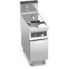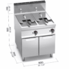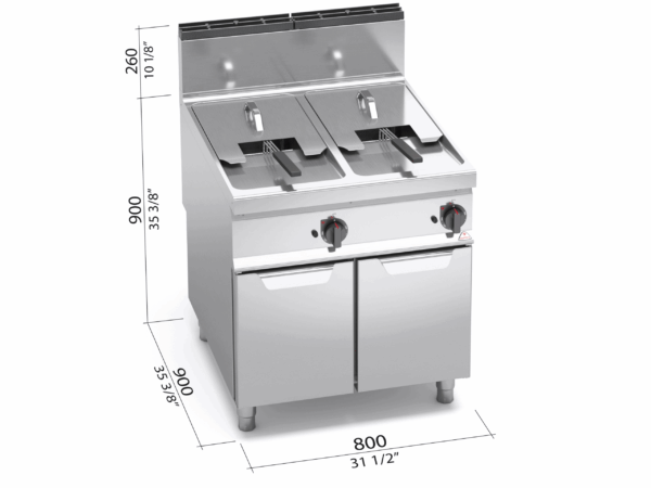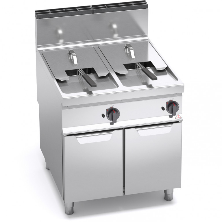 Piano di lavoro e pannelli frontali in acciaio inox AISI 304. Vasca stampata con profilo ad ampia zona fredda per raccolta residui cibo e grande facilità di pulizia grazie all’assenza di tubi ed alla grande sezione dello scarico da 1”. Il piano, dai bordi arrotondati, incorpora una superficie per l’appoggio dei cesti leggermente inclinata, favorendo lo scarico dell’olio. Due bruciatori in acciaio inox, posti esternamente alla vasca, comandati da elettrovalvola con controllo della temperatura tramite termostato elettrico di alta precisione. Termostato di sicurezza a riarmo manuale, fiamma pilota e sistema di sicurezza con termocoppia. Rubinetto di scarico a sfera, situato all’interno del vano, comandato da maniglia con impugnatura atermica, con bacinella di raccolta in acciaio. Accensione elettrica. Piedini regolabili.