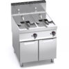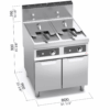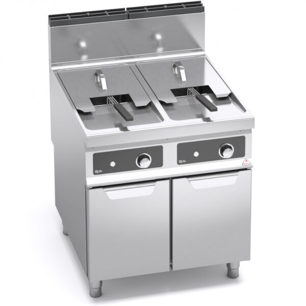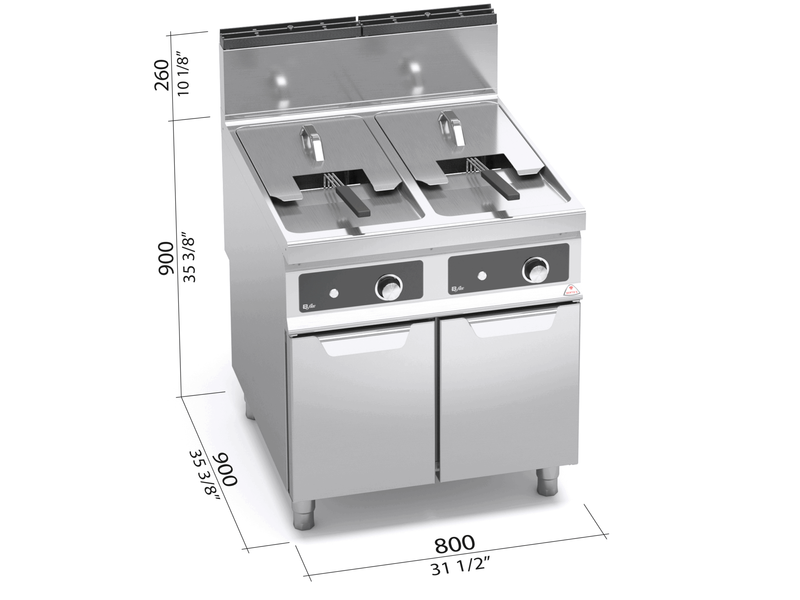Vasca stampata con profilo ad ampia zona fredda per raccolta residui cibo e grande facilità di pulizia grazie all’assenza di tubi ed alla grande sezione dello scarico da 1”. Il piano, dai bordi arrotondati, incorpora una icie per l’appoggio dei cesti leggermente inclinata, favorendo lo scarico dell’olio. Due bruciatori in acciaio inox, posti esternamente alla vasca, comandati da elettrovalvola con controllo della temperatura tramite centralina elettronica con le seguenti funzioni: controllo della temperatura da 100 °C a 190 °C, visualizzazione della temperatura impostata, programma di “melting” e di mantenimento a 100 °C per l’utilizzo di grassi solidi di frittura, autodiagnostica per eventuali anomalie. Termostato di sicurezza a riarmo manuale, fiamma pilota e sistema di sicurezza con termocoppia. Rubinetto di scarico a sfera, situato all’interno del vano, comandato da maniglia con impugnatura atermica, con bacinella di raccolta in acciaio. Accensione elettrica. Piedini regolabili.