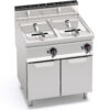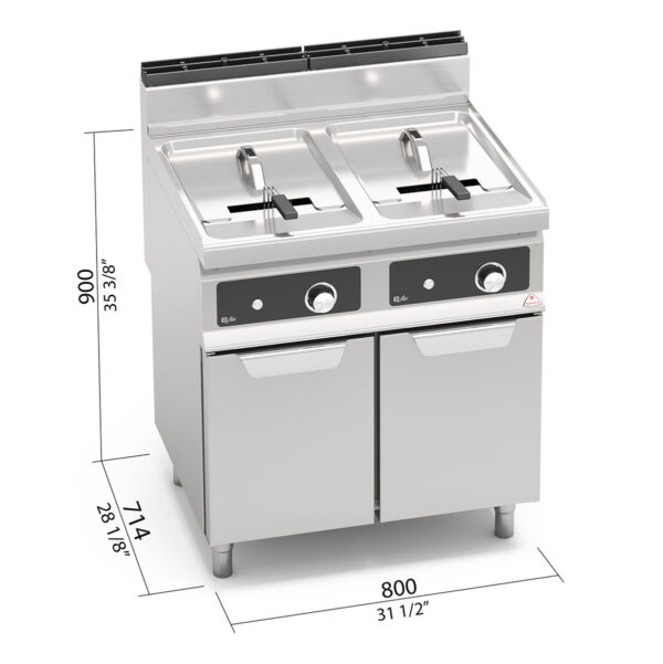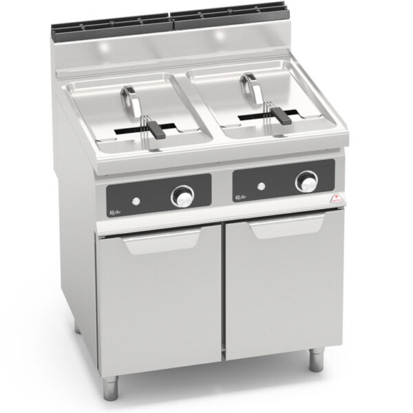 Piano vasca e pannelli frontali in inox AISI 304. Due vasche arrotondate indipendenti con profilo ad ampia zona fredda per raccolta residui cibo e grande facilità di pulizia grazie all’assenza di tubi ed alla grande sezione dello scarico da 1”. Due bruciatori in acciaio inox, posti esternamente alla vasca, comandati da elettrovalvola con controllo della temperatura tramite termostato elettrico di alta precisione. Il sistema di frittura, conservando inalterate le caratteristiche organolettiche dell’olio, permette di cucinare in maniera sana limitando il numero dei cambi di olio, con un notevole risparmio finale. Fiamma pilota e sistema di sicurezza con termocoppia e termostato. Regolazione della temperatura da 110 a 190 °C. Produzione massima oraria stimata 40 kg. Tempo medio di frittura 6 minuti. Preriscaldamento 10 minuti (da 20 a 190 °C). Accensione elettrica. Piedini regolabili.