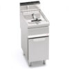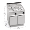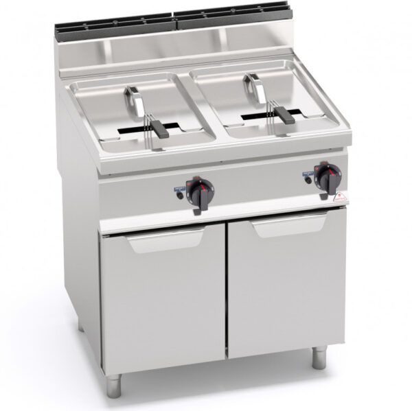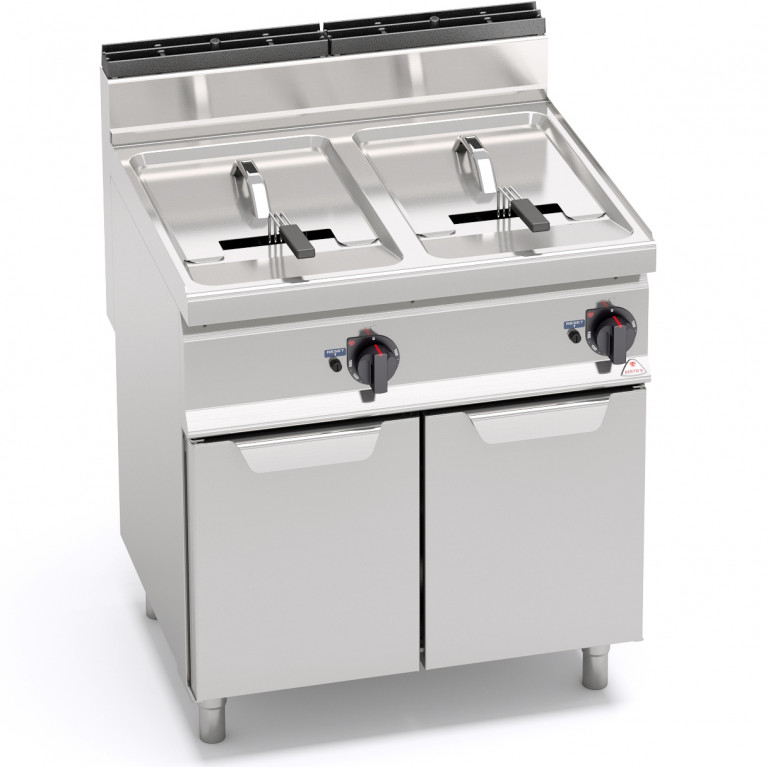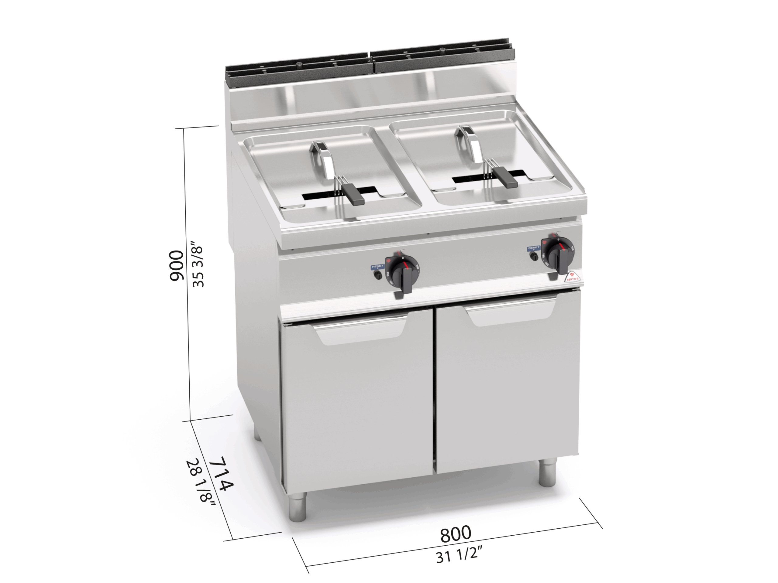 Piano vasca e pannelli frontali in inox AISI 304. Due vasche arrotondate indipendenti con profilo ad ampia zona fredda per raccolta residui cibo e grande facilità di pulizia grazie all’assenza di tubi ed alla grande sezione dello scarico da 1”. Due bruciatori in acciaio inox, posti esternamente alla vasca, comandati da elettrovalvola con controllo della temperatura tramite termostato elettrico di alta precisione. Il sistema di frittura, conservando inalterate le caratteristiche organolettiche dell’olio, permette di cucinare in maniera sana limitando il numero dei cambi di olio, con un notevole risparmio finale. Fiamma pilota e sistema di sicurezza con termocoppia e termostato. Regolazione della temperatura da 110 a 190 °C. Produzione massima oraria stimata 40 kg. Tempo medio di frittura 6 minuti. Preriscaldamento 10 minuti (da 20 a 190 °C). Accensione elettrica. Piedini regolabili.