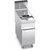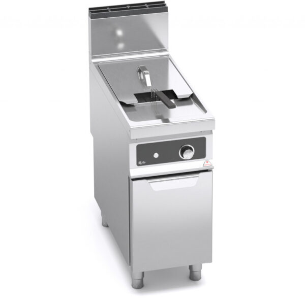 Piano di lavoro e pannelli frontali in acciaio inox AISI 304. Bruciatori in acciaio inox a sezione ovale a nido d’ape. Scambiatori di calore a sezione ovale di grande superficie, posti direttamente all’interno della vasca, per un riscaldamento rapido ed omogeneo. Fiamma pilota e valvola di sicurezza a termocoppia. Vasca in acciaio inox AISI 304 con ampi bordi arrotondati e ampia zona fredda, sottostante i bruciatori, per la decantazione dei residui. Il piano, dai bordi arrotondati, incorpora una superficie per l’appoggio dei cesti leggermente inclinata che favorisce lo scarico dell’olio. Controllo della temperatura tramite centralina elettronica con le seguenti funzioni: controllo della temperatura da 100 a 190 °C, visualizzazione della temperatura impostata, programma di “melting” e di mantenimento a 100 °C per l’utilizzo di grassi solidi di frittura, autodiagnostica per eventuali anomalie. Termostato di sicurezza a riarmo manuale. Rubinetto di scarico a sfera, situato all’interno del vano, comandato da maniglia con impugnatura atermica.