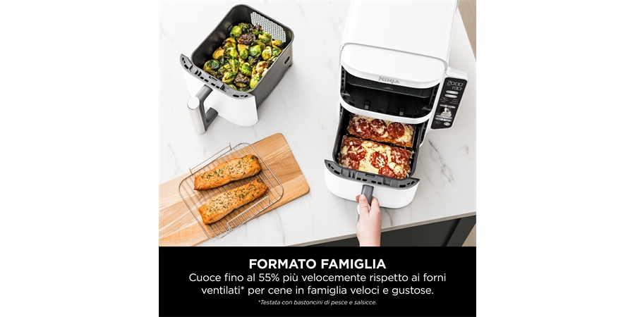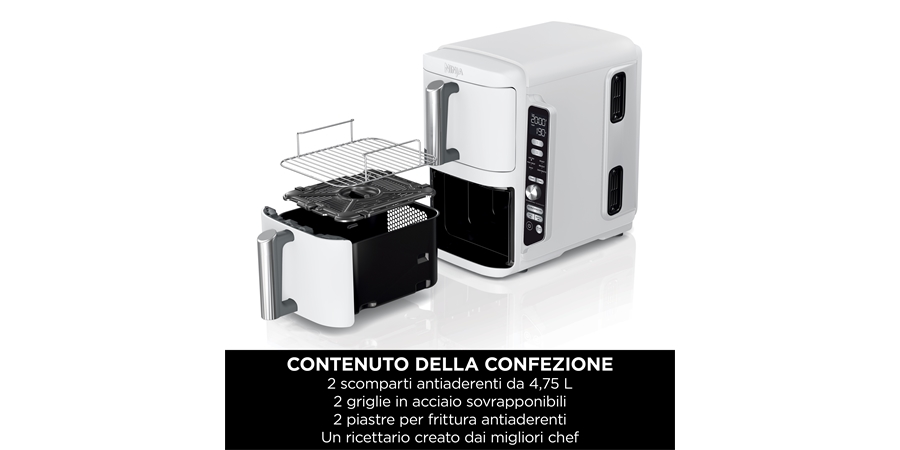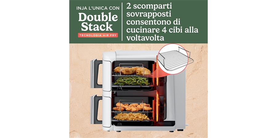 - Cuoce uniformemente 4 pietanze diverse grazie alle 2 griglie Double Stack