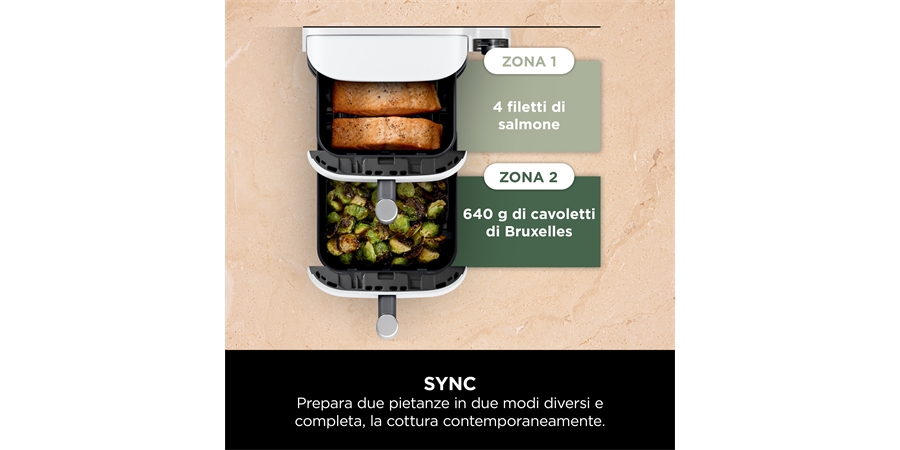 imposta tempi, temperature e programmi di cottura diversi in ogni scomparto. La funzione SYNC porta a termine la cottura di entrambi gli scomparti nello stesso momento, per assaporare pietanze e contorni insieme, servire un buffet con cibi preparati al momento o accontentare i palati di tutti i commensali con un menu diversificato.