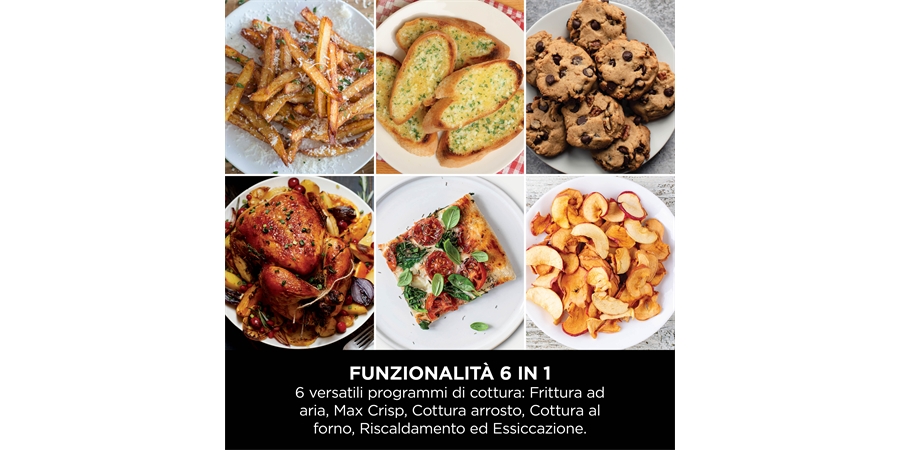 - 6 funzioni: Frittura ad aria, Max Crisp, Cottura arrosto, Cottura al forno, Essiccazione, Riscaldamento.