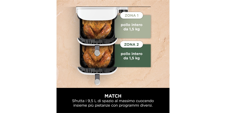 Questa friggitrice ad aria a 2 scomparti può contenere un pollo arrosto intero da 1,4 kg in ogni scomparto da 4,75 L ed è perfetta per famiglie numerose e cene in compagnia. Perfetta per un massimo di 8 persone.