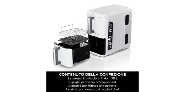 - 2 scomparti da 4,75 L e piastre per frittura antiaderenti, lavabili in lavastoviglie, 2 griglie in acciaio inox, ricettario.