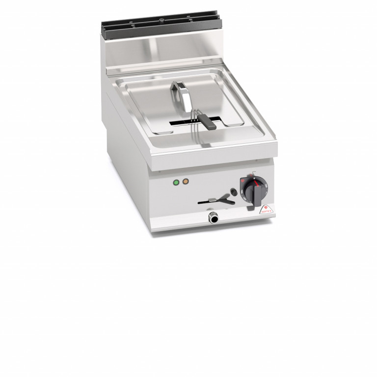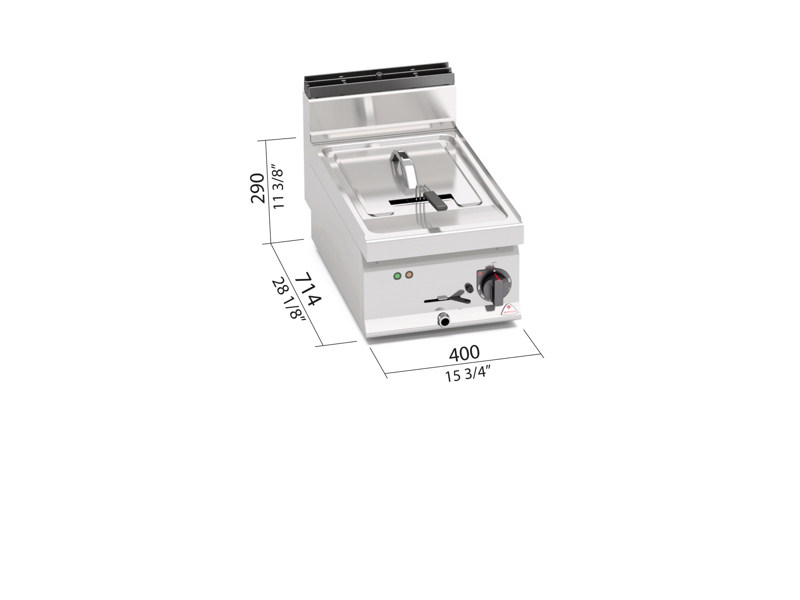 Piano vasca e pannelli frontali in INOX AISI 304. Vasca stampata e arrotondata dotata di speciali resistenze rotanti in acciaio inox incoloy ad elevata durata, possono raggiungere in brevissimo tempo la temperatura di lavoro, consentendo un risparmio d’olio del 60%. Il sistema di frittura, conservando inalterate le caratteristiche organolettiche dell’olio, permette di cucinare in maniera sana limitando il numero dei cambi di olio, con un notevole risparmio finale. La rotazione della resistenza facilita le operazioni di pulizia. Controllo della temperatura impostata mediante termostato regolabile fino a 190°C e termostato di sicurezza a riarmo manuale. Tempo medio di frittura 4 minuti. Preriscaldamento 4-5 minuti (da 20 a 190°C). Produzione massima 25 kg/h (E7F10-4B, E7F10-4M), 30 kg/h (E7F10-4BS, E7F10- 4MS). Piedini regolabili (versione con mobile).