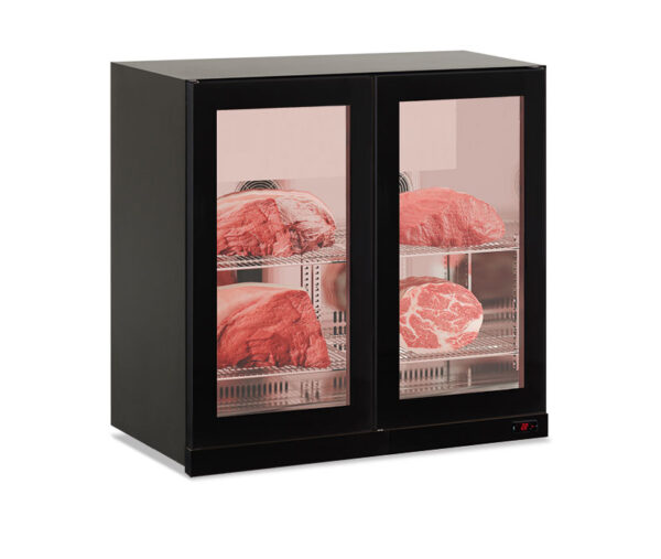 Il design elegante nero (BLK) con vetri frontali valorizza il prodotto esposto, mentre l’interno in acciaio inox AISI 304 garantisce massima igiene e facilità di pulizia. Grazie al controllo di temperatura e umidità, mantiene condizioni ideali per la conservazione della carne.
