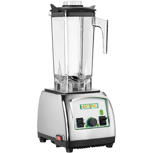 Macchine per la preparazione di frullati – bicchiere in lexan trasparente da 2 L – microinterruttore di sicurezza sul bicchiere – coltello a 4 lame in acciaio inox – tappo sul coperchio per aggiungere ingredienti in fase di lavoro. Carcassa in plastica cromata – regolatore di velocità – tasto “pulse”
